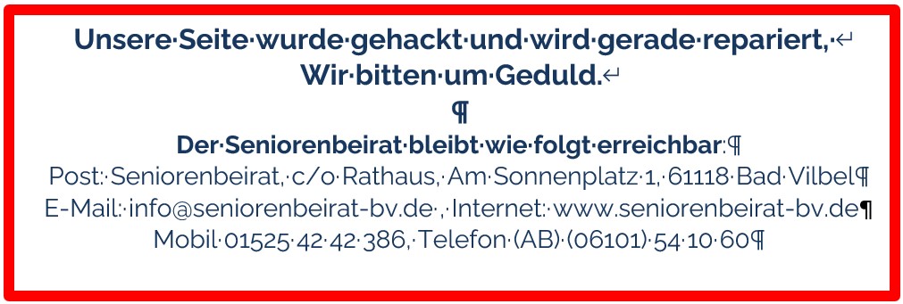 Wahrscheinlich war es daher noch nie so wichtig wie heute, eine Vertretung zu haben, die sich für die Interessen älterer Menschen gegenüber Politik und Verwaltung auf kommunaler Ebene einsetzt. Genau das tut der Seniorenbeirat. Wir nehmen uns der Nöte und Sorgen der Seniorinnen und Senioren von Bad Vilbel an.